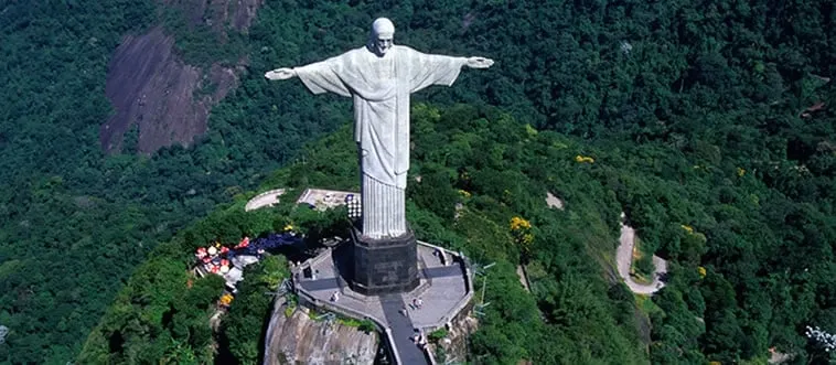 Christ the Redeemer, a massive Art Deco statue of Jesus with outstretched arms, overlooks a bustling city from a mountain peak. Which country?