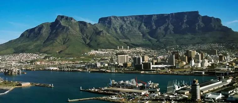The Table Mountain, a flat-topped peak with cable car access, overlooks a coastal city and harbor. Which country?