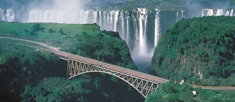The Victoria Falls, a massive waterfall known locally as “The Smoke That Thunders,” straddles a river border. Which country?