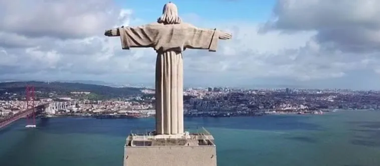 The Sanctuary of Christ the King, a hilltop figure with arms wide, watches over a river city. Which country?